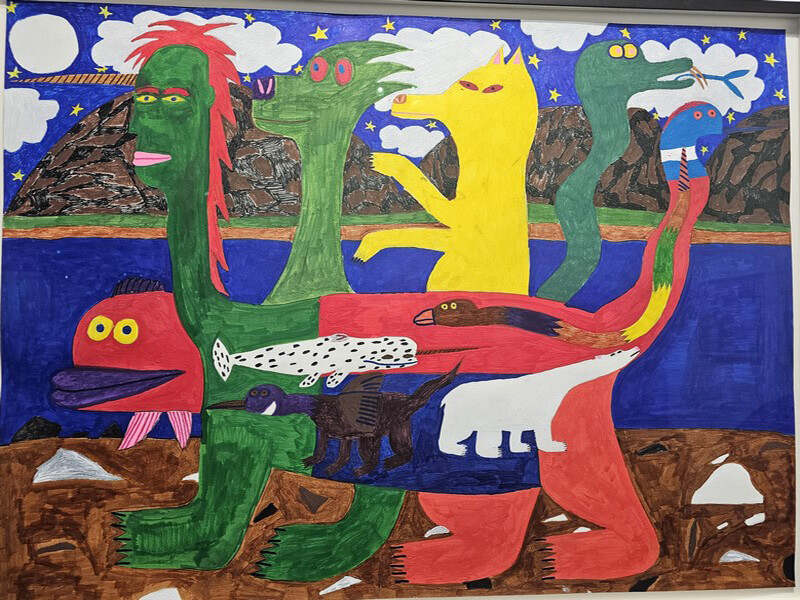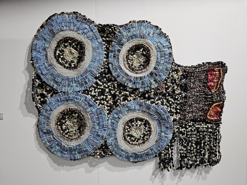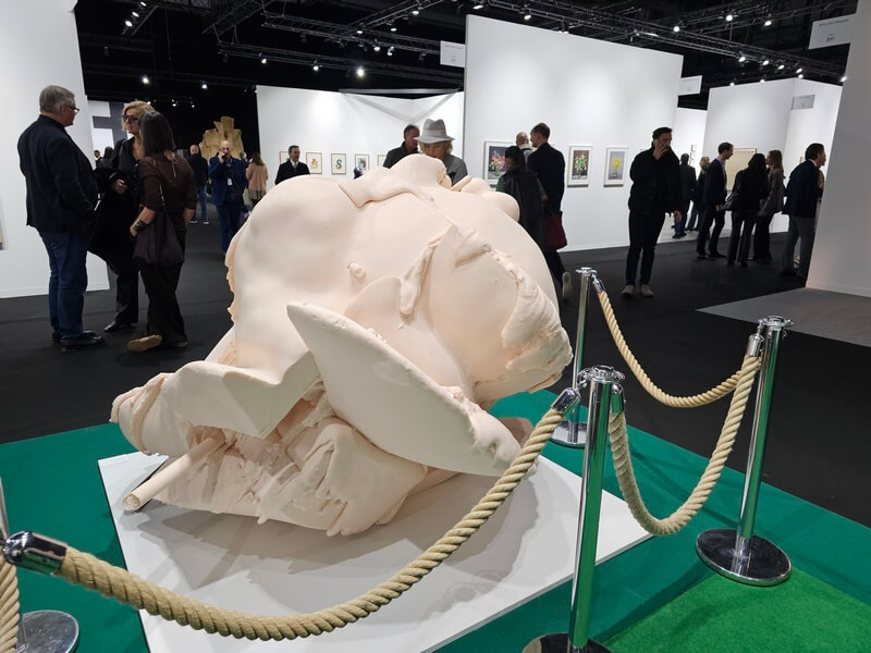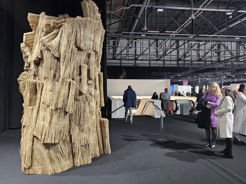 La visite donne le ton en arrivant par l’escalator ! Imposant et vaste, l’espace se trouve calqué sur une dynamique rigoureusement étudiée, élégante et design… D’emblée, impressionnant accueil :  une immense sculpture faisant partie des créations monumentales, un ensemble de matières recyclées, bois, métal, plastique où le chaume s’affirme par sa présence organique : Le Rocher de Cassandre Albert ! En premières visions, le cheminement se poursuit à la rencontre d’accrochages impérieux qu’on ne saurait ignorer, une fresque de Jacques Villeglé et une création de Paul McCarthy… La déambulation continue à la découverte de stands exposant des artistes à l’inspiration foisonnante, générant des tréfonds de l’intime, des sentiments exprimés en matériaux, formes et couleurs improbables. Riches en questionnements… Et assertions !