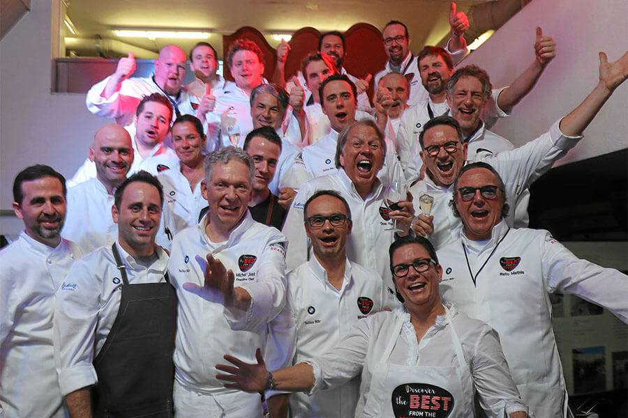 Accueillis par des animations gourmandes sur les sommets à plus de 2486m d’altitude, tour à tour en cuisine à la table du Chef au Badrutt’s Palace… ou de Kitchen Party en Gourmet Safaris, les passionnés de gastronomie ont été princièrement véhiculés de palace en palace en limousines par BMW sponsor de la manifestation. De l’élégant dîner Fascination Champagne aux accords de la sublime effervescence de Laurent Perrier se tenant au prestigieux Suvretta House, à la cérémonie du chocolat et son culte célébrés au Badrutt’s Palace sous l’inspiration de son chef pâtissier Stefan Gerber, les plaisirs ont été intenses et variés. Point d’orgue de la semaine, la soirée de clôture Great BMW Gourmet Finale au Kulm Hotel St. Moritz. La symphonie gastronomique de 10 plats – accords alcool et mets – pour une partition concoctée en bouquet par les 20 Chefs -résidents et invités- a été l’apothéose !